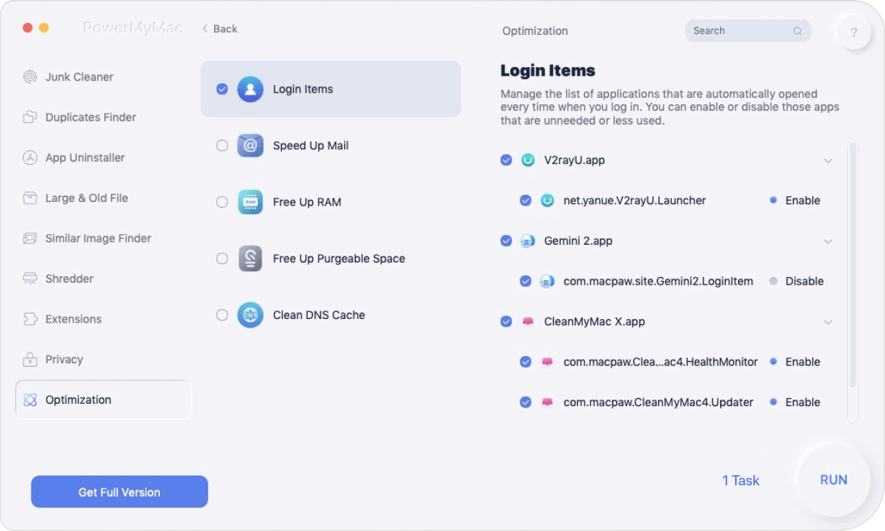 Кроме того, вы также можете использовать функцию этого инструмента, которая удаляет элементы входа в систему из mshelper. Сквозь «Оптимизация» PowerMyMac, вы можете управлять тем, что происходит на Mac, что может повысить производительность. Чтобы ускорить работу вашего Mac, вы можете использовать следующие пять функций этого приложения: Освобождение очищаемого пространства, Освобождение ОЗУ, Ускорение почты, Элементы входа и очистка кэша DNS.