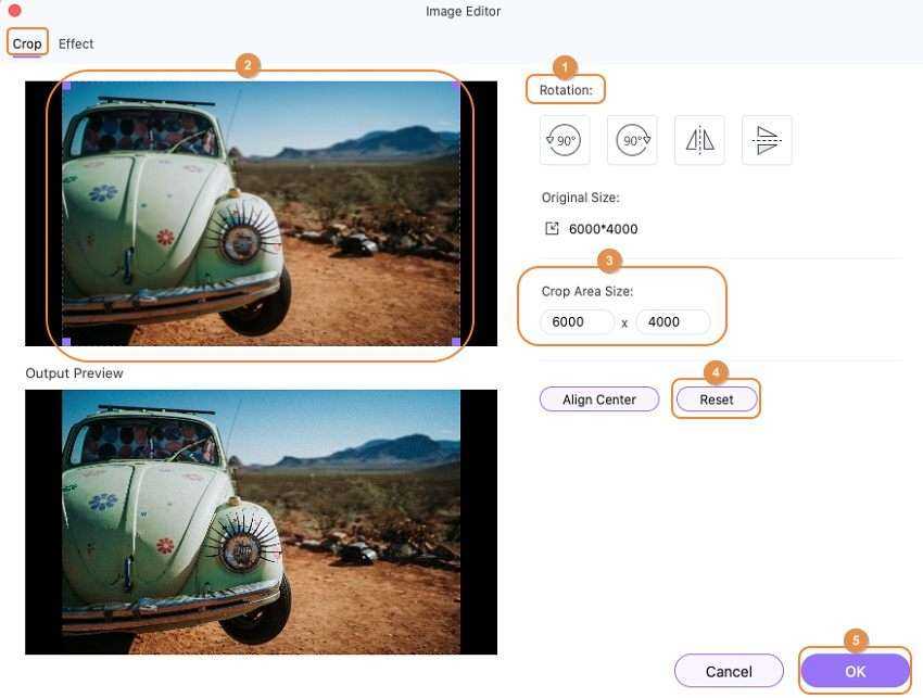 - Обрезать: Нажмите на вкладку «Обрезка» и начните настраивать размер изображения, обрезая его вручную. Вы также можете вращать и переворачивать изображения.