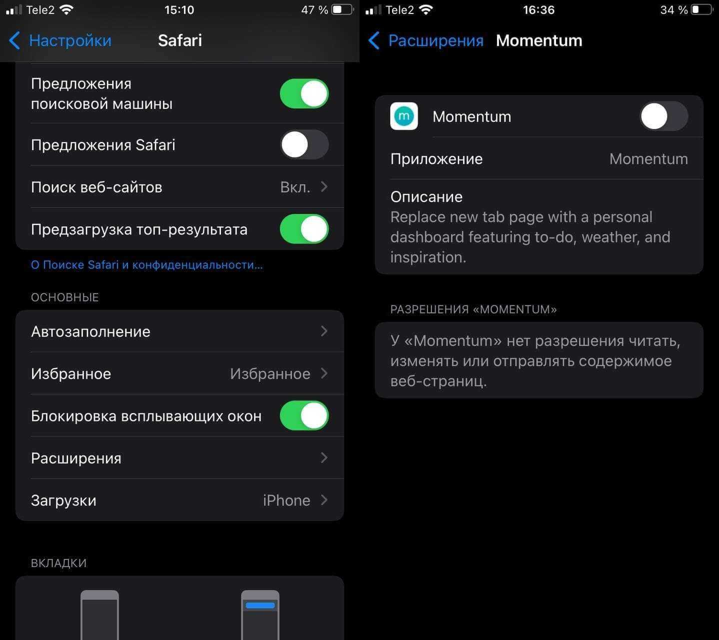 - В окне настроек Safari откройте вкладку «Расширения».