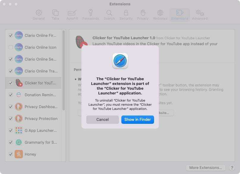 Чтобы отключить или удалить расширение, перейдите в Safari> «Настройки», затем нажмите « Расширения» на панели инструментов.