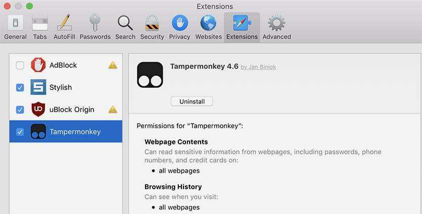 Управление расширениями Safari