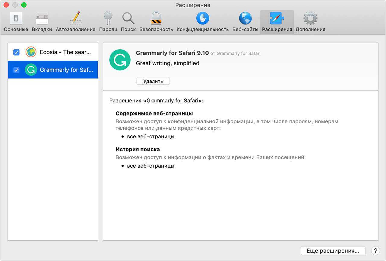 Расширения Safari, которые вы больше не используете, могут быть отключены или удалены. Если у вас возникают проблемы в Safari, вы можете отключить все свои расширения, а затем повторно включить их по одному. Это может помочь вам определить, является ли расширение причиной проблемы, и какой именно. Если вы решите, что вам больше не нужно расширение, вы можете удалить его.