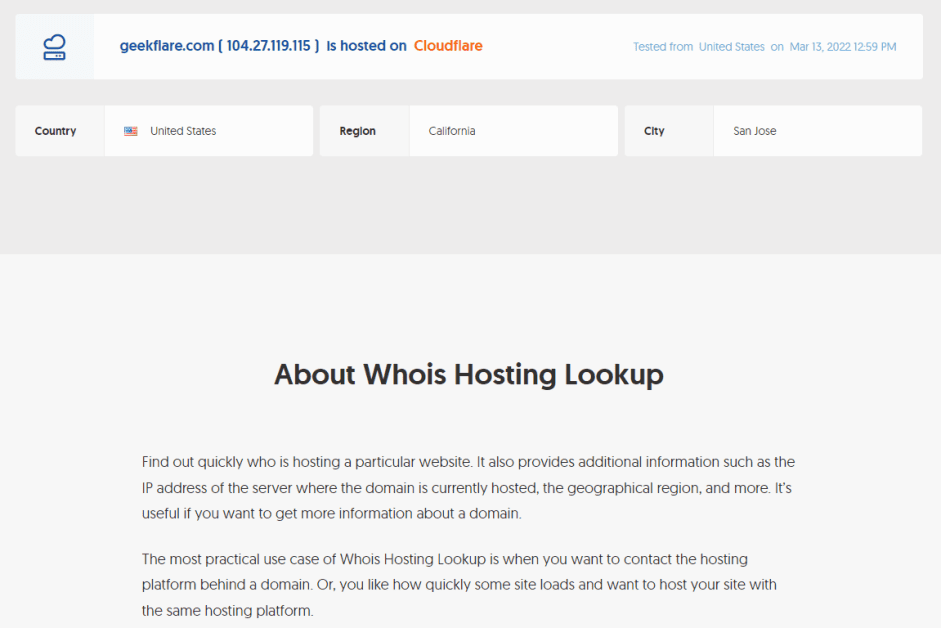 Вы можете просто ввести доменное имя веб-сайта, который вы ищете, чтобы найти IP-адрес, и нажать кнопку «Найти хост», и инструмент покажет вам IP-адрес веб-сайта, а также другую интересную информацию, такую как местоположение и сведения о хостинге.