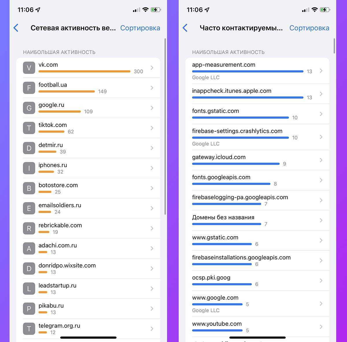 ◉ Последний пункт отчета Часто контактируемые домены покажет адреса, к которым обращаются одно или несколько приложений на устройстве. Здесь увидите, на сервисы каких компаний больше всего завязана работа тех или иных приложений на устройстве.