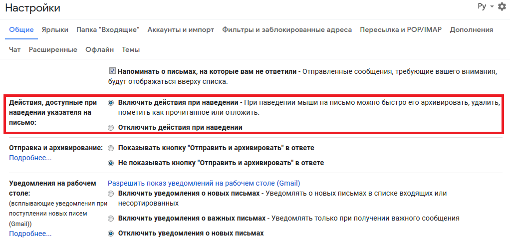 - В секции «Общие» найдите «Действия, доступные при наведении указателя на письмо» и выберите «Отключить». Затем пролистайте страницу вниз и нажмите «Сохранить изменения».