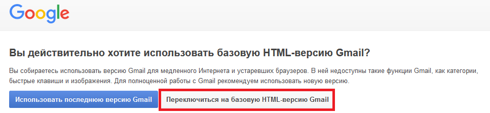 - Вверху экрана нажмите «Переключиться на базовую HTML-версию Gmail», чтобы выбрать такой дизайн по умолчанию».