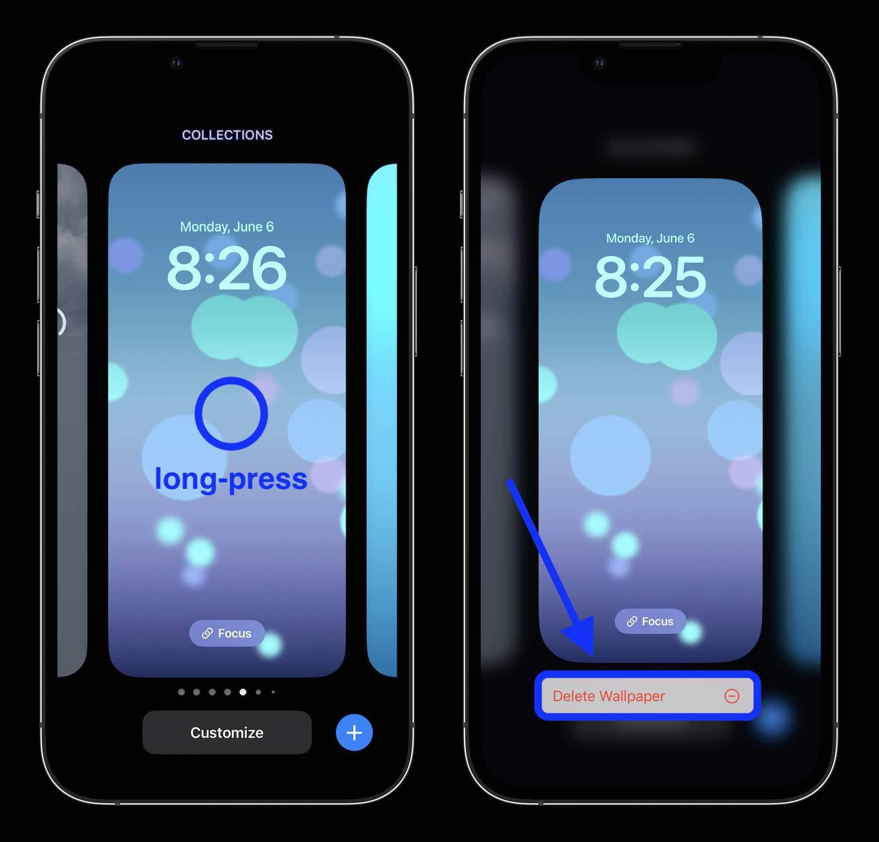 Чтобы удалить пользовательские экраны блокировки, нажмите и удерживайте один из них и выберите «Удалить обои» внизу.