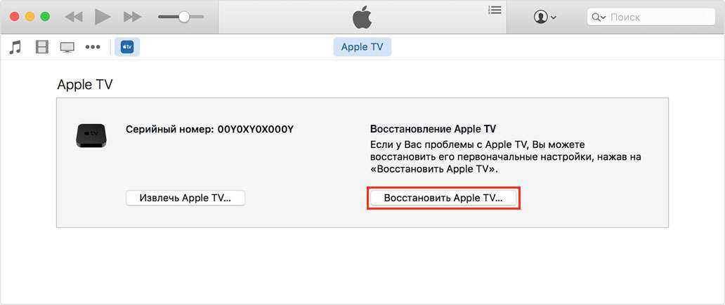 Если приложение «iTunes» не определяет ваше устройство «Apple TV», то возможно вам придется перевести его в режим “восстановления”.