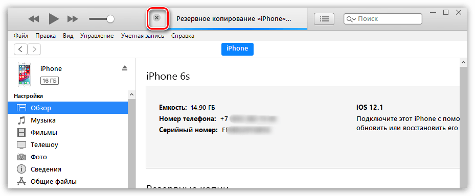 - Подключите iPhone к компьютеру с помощью USB-кабеля (при использовании WiFi-синхронизации восстановление будет недоступно) и запустите iTunes. Если программа начнет автоматически обновлять резервную копию, вам потребуется отменить данный процесс, кликнув в верхней части окна по иконке с крестиком.