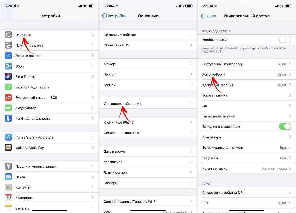 Зайдите в «Настройки» → «Основные», щелкните по пункту «Универсальный доступ» и выберите «AssistiveTouch».