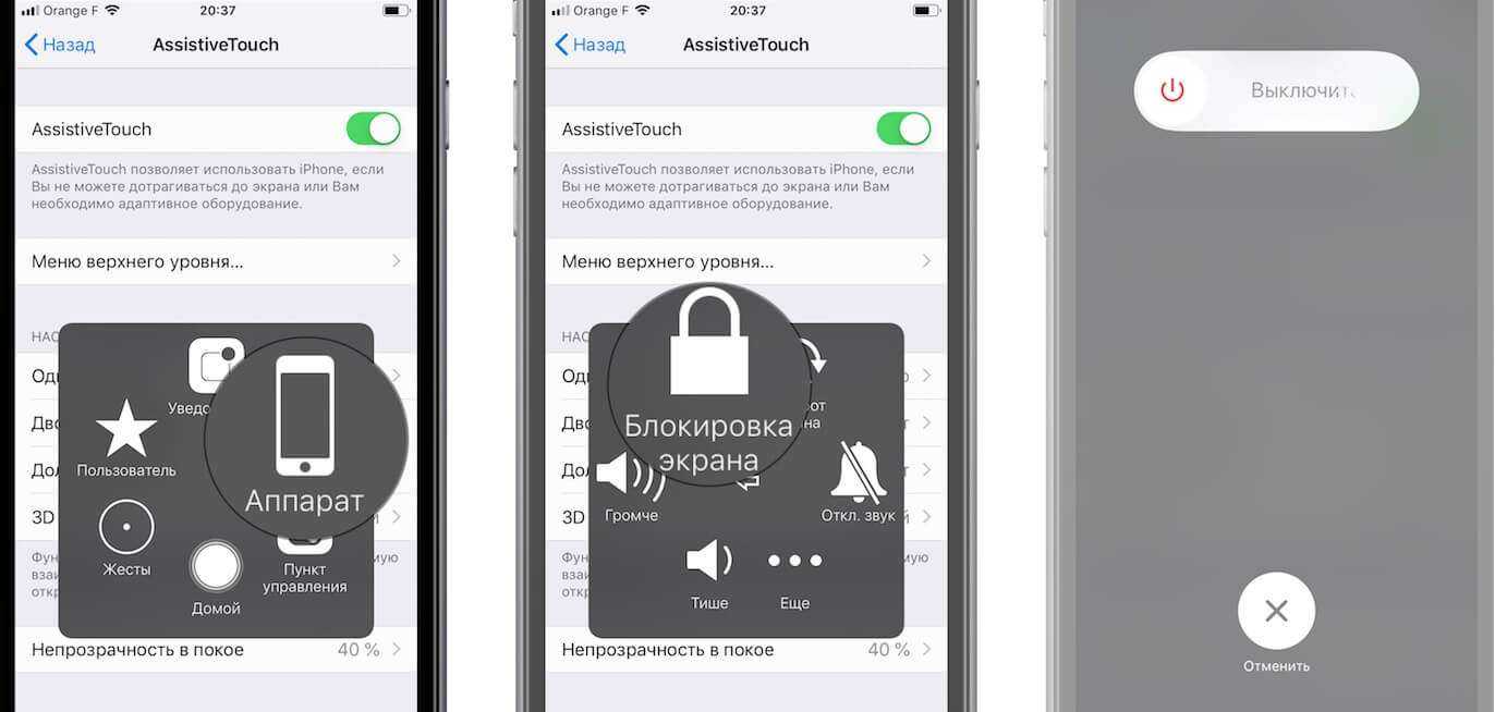 После этого на экране отобразится функциональная кнопка Assistive Touch. Она будет здесь всегда, пока пользователь самостоятельно не отключит ее. Чтобы выключить iPhone 11-й, необходимо тапнуть по наэкранной кнопке, перейти в раздел «Аппарат» и удержать палец на иконке «Блокировка экрана». Затем останется лишь передвинуть ползунок выключения вправо.
