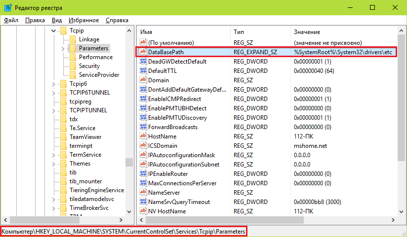 Второй вариант — это перемещение файла Hosts в другое, более укромное место. Куда его поместить, решайте сами, но чтобы система его не потеряла, придется внести небольшую правку в реестр. Откройте в редакторе RegEdit ветку HKEY_LOCAL_MACHINESYSTEMCurrentControlSetServicesTcpipParameters и в значении параметра DataBasePath пропишите новый путь к Hosts.
