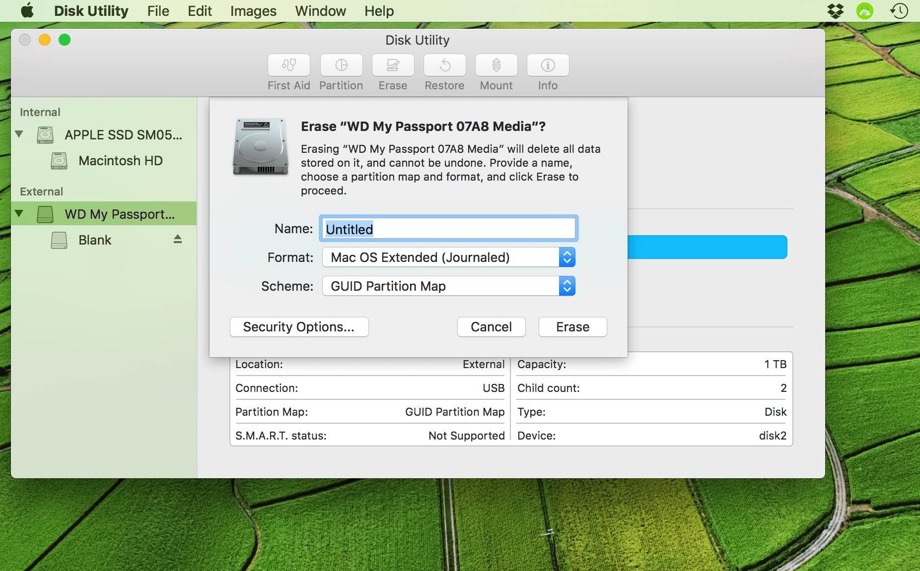 Следующим шагом определите имя накопителя — простое и запоминающееся слово, введенное латиницей. Оно вам вскоре понадобится. В перечне доступных форматов вам нужен «Mac OS Extended (журналируемый)». Схема: «Схема разделов GUID». Нажмите кнопку «Стереть» в диалоговом окне. Форматирование накопителя займет некоторое время.