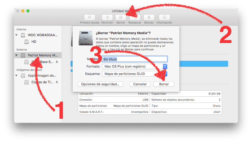 - Мы выбираем корень USB, нажимаем «Удалить» и выбираем все, как на следующем снимке экрана (мы можем указать любое имя, какое захотим):