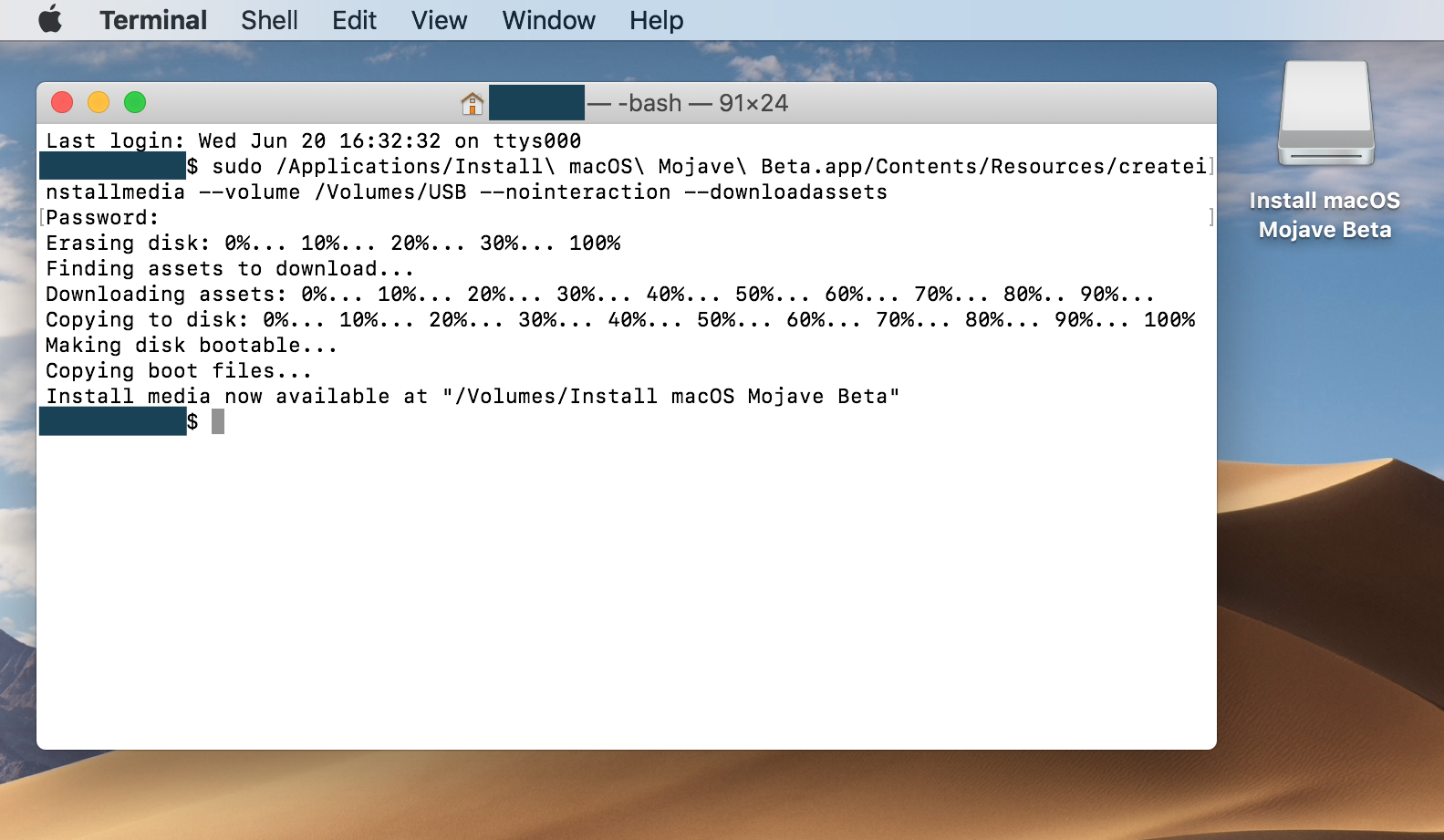 NB: If you renamed the “Install macOS Mojave.app” or your USB drive to something other than what I advised above, you must edit the command to match your chosen names. Similarly, if you moved the installer out of the /Applications folder, you must change the above command to show its new filepath.