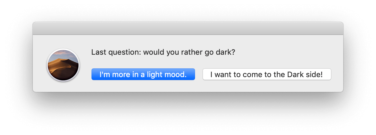 Нажмите одну из кнопок: «I’m more a light mood» (светлая) или «I want to come to the Dark side!» (темная). Таким образом вы определите предпочитаемую тему интерфейса.