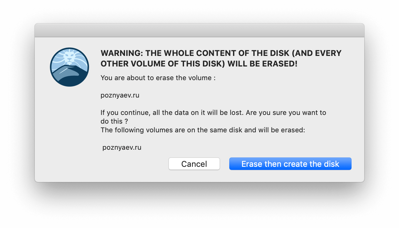 В следующем окне нажмите кнопку «Erase then create the disk». Этим действием вы даете свое согласие на полное удаление всей информации с накопителя и его форматирование. Если на нем остались важные файлы, перед этим шагом у вас еще есть возможность сохранить их в другом месте.