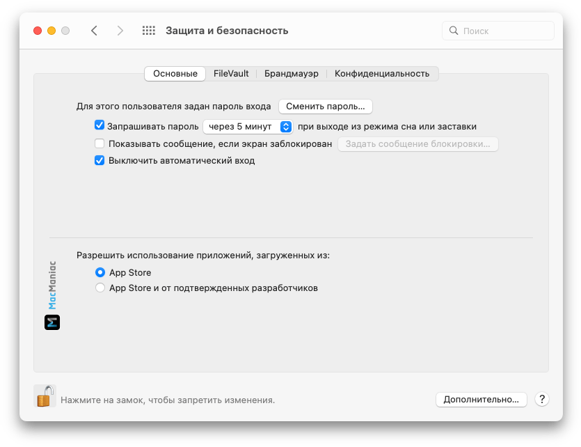 По умолчанию разрешены только приложения из первых двух категорий: Mac App Store и от определенных разработчиков. Этот параметр должен обеспечивать достаточный уровень безопасности, позволяя пользователям получать приложения из магазина приложений или загружать подписанные приложения из Интернета.