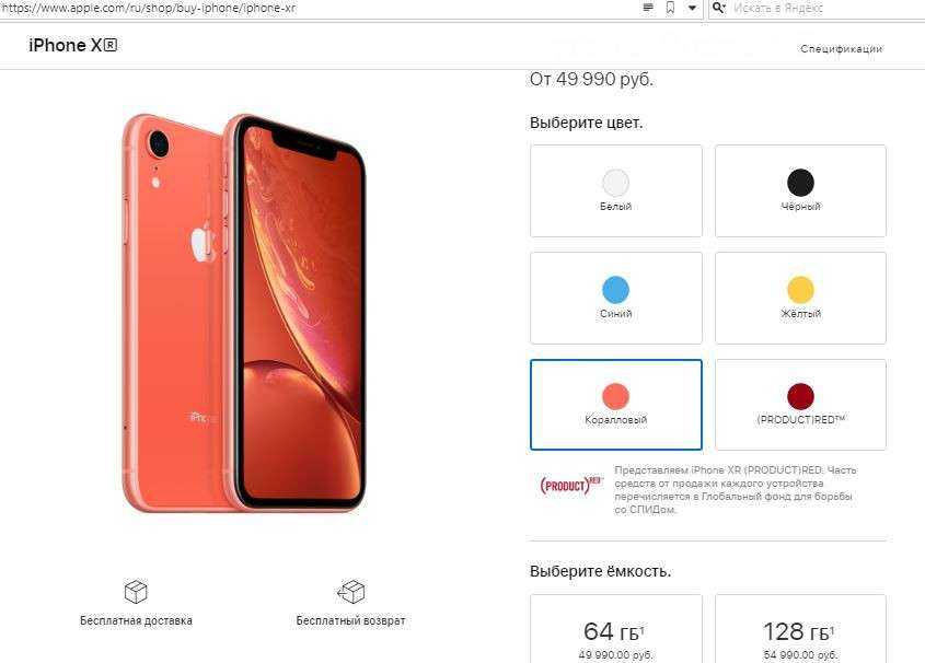 - iPhone XR – от 64 890 ₽ (синий, коралловый, желтый, белый, черный, красный).
