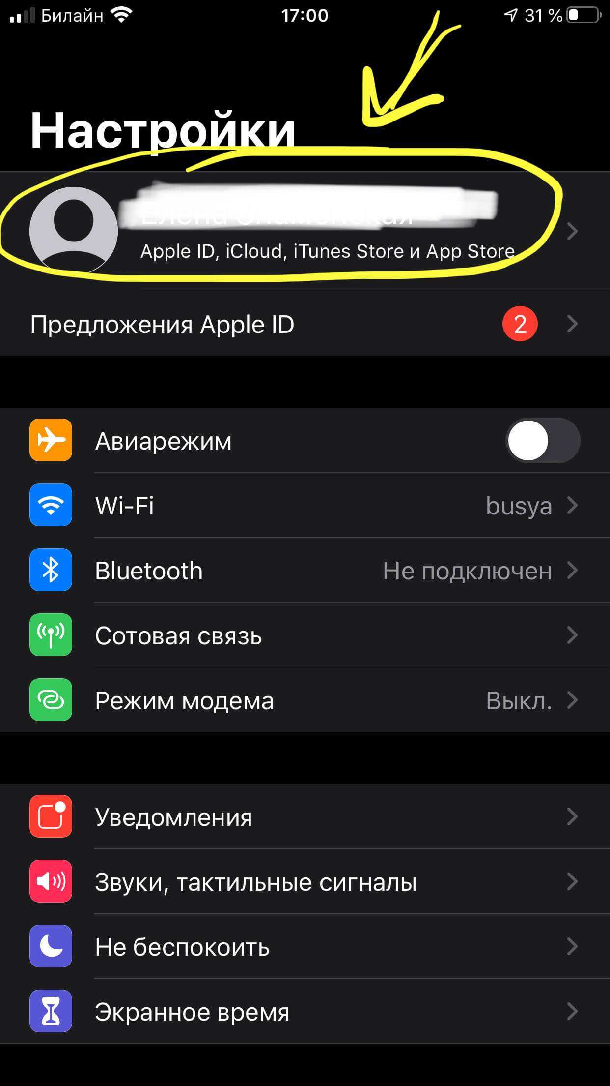 Заходим в Настройки, в самой верхней строчке находим раздел Apple ID — со своим именем и фамилией). Нажимаем на него.