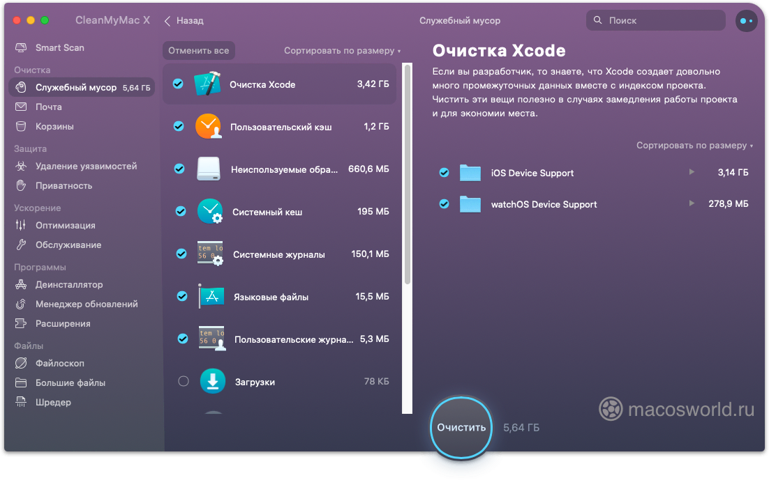 По умолчанию CMM не удаляет некоторые из категорий, например, кеш Xcode и когда-то загруженные dmg-файлы приложений. Поэтому всегда просматривайте раздел Служебный мусор и помечайте всё то, что вам более не нужно.