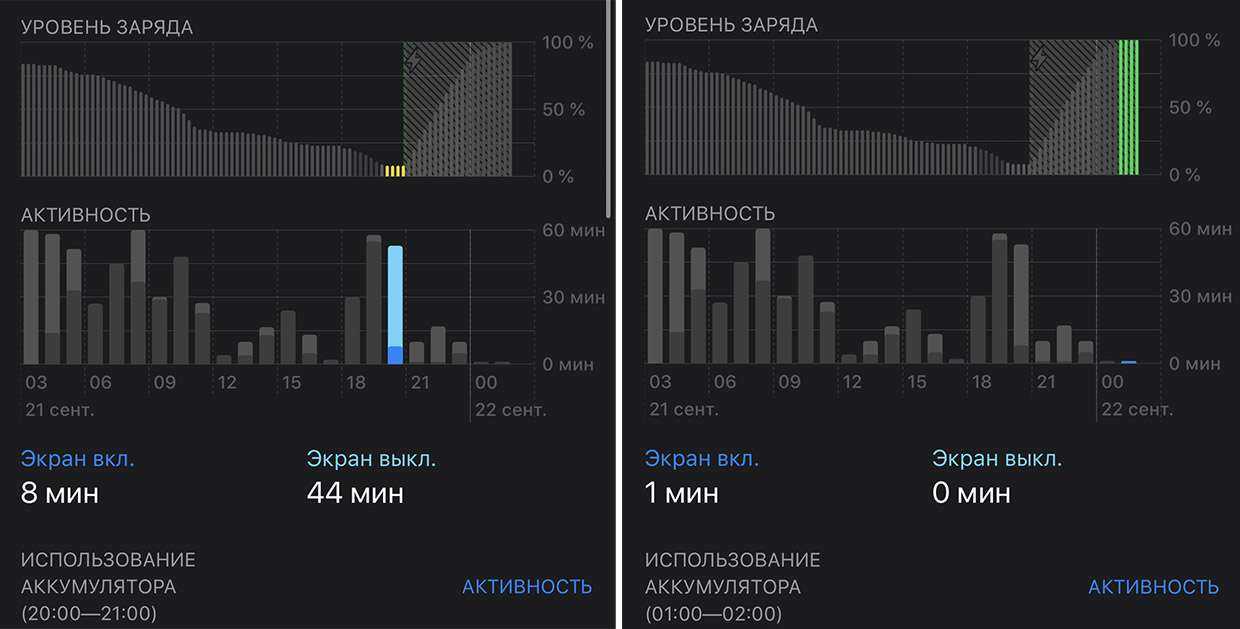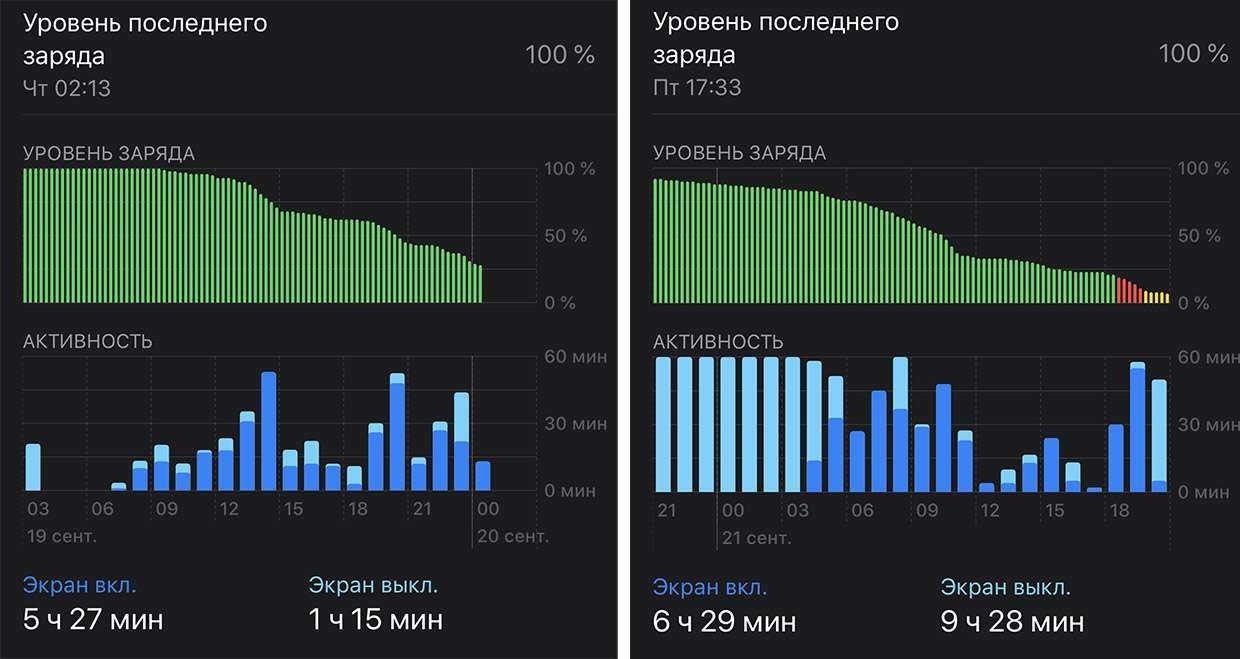 Пример 1. Снял айфон с зарядки в 02:10 в четверг. Использовать начал с 6 утра и почти не выпускал его из рук до полуночи. К 00:30 следующего дня оставалось 27% заряда, которые закончились к 10 часам дня при умеренной нагрузке.