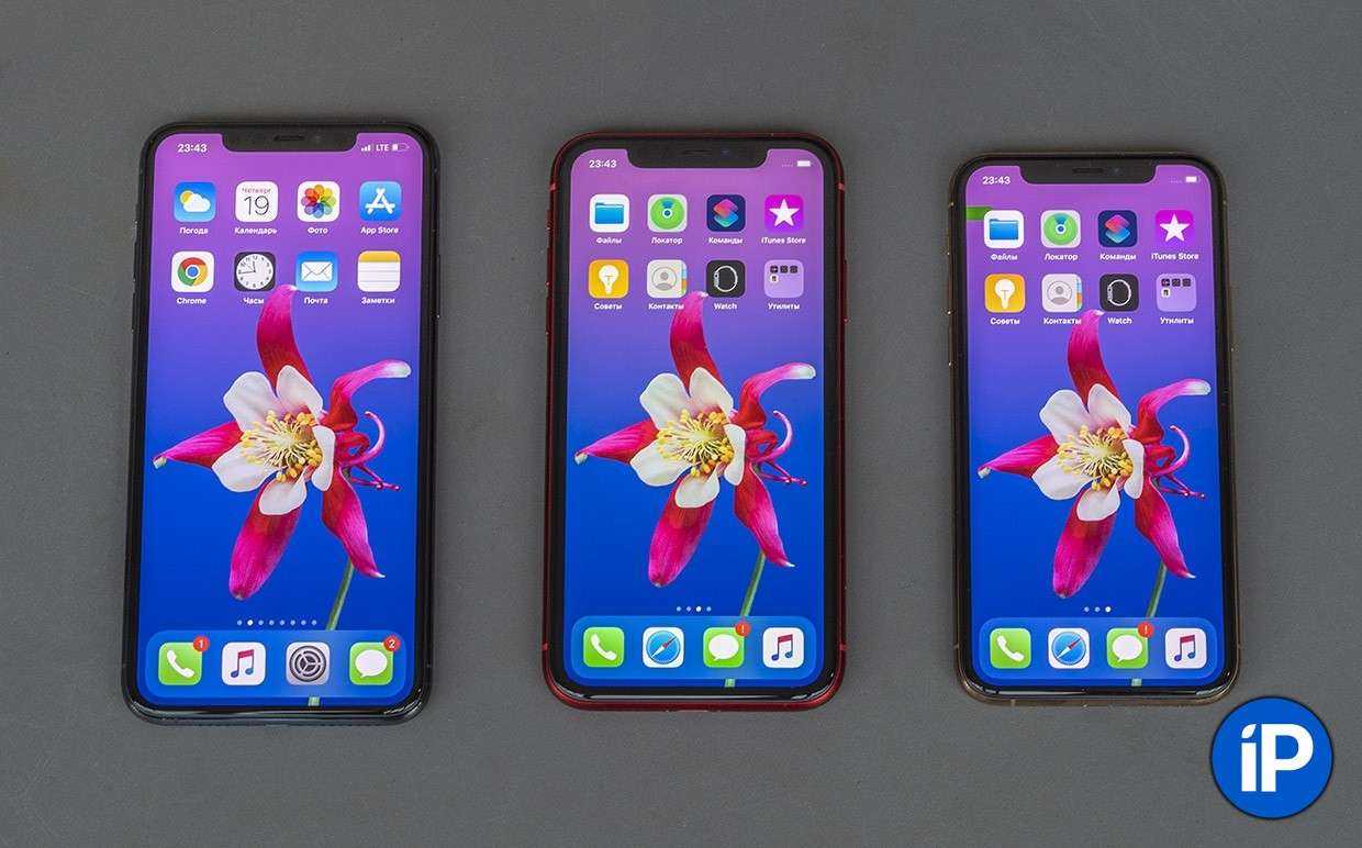Слева iPhone 11 Pro Max, посередине iPhone 11, справа iPhone 11 Pro. Видите разницу? Верно, спереди её почти нет.
