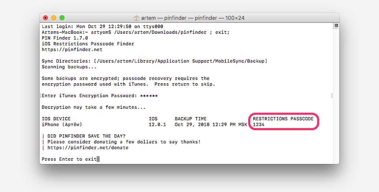 Таким же способом можно узнать пароль от Ограничений в iOS 11 и более старых версиях системы.