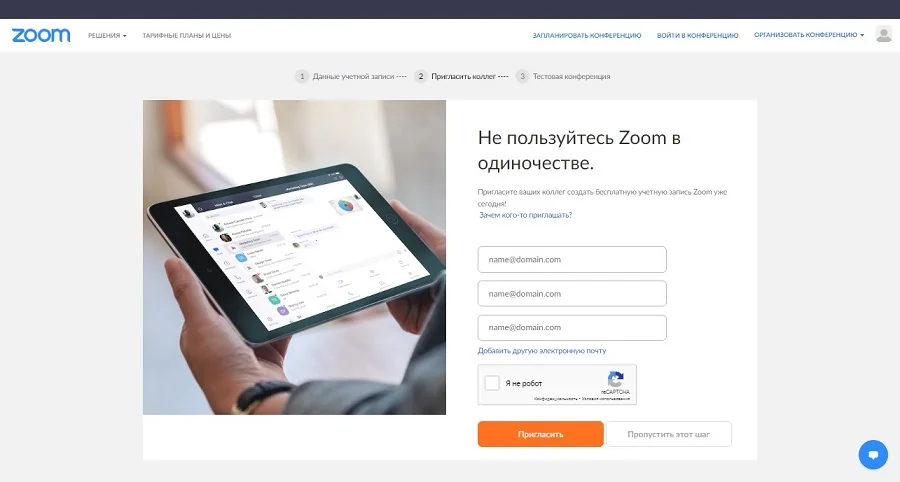 6. Теперь вы можете прислать приглашения своим коллегам и знакомым. Для этого укажите их адрес электронной почты. Этот этап можно отложить, для этого кликните «Пропустить этот шаг».