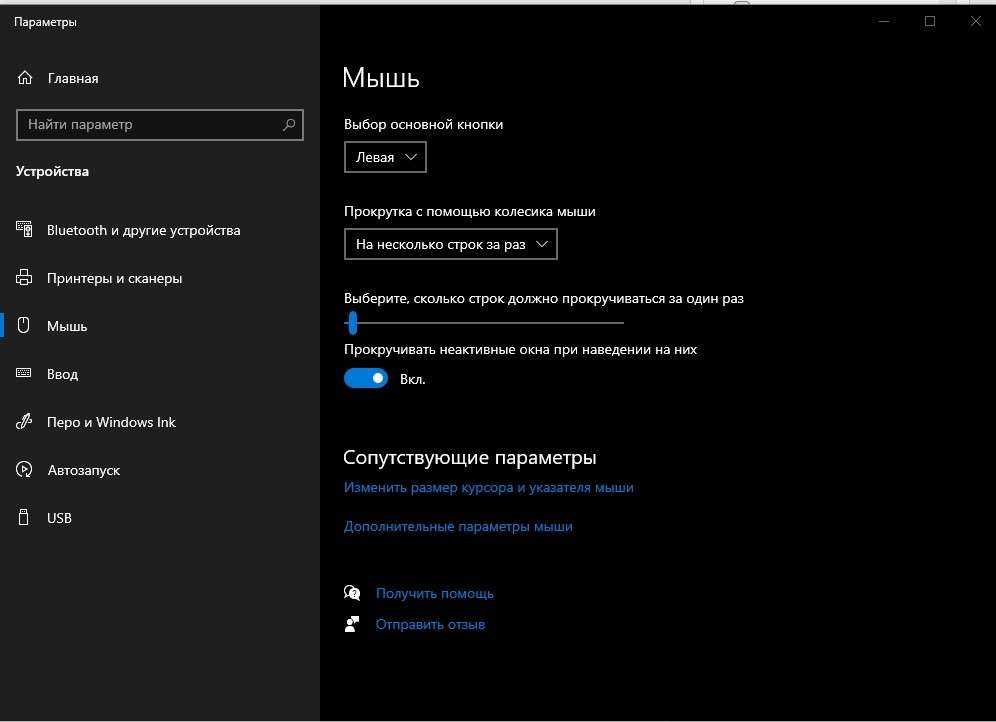 В появившемся списке найти раздел «Параметры мыши». Далее настройки выполняются в обычном режиме. Переместить ползунок можно несколько раз – установить значение и проверить реакцию устройства, чтобы убедиться в корректности работы устройства управления.