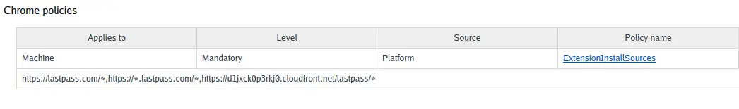 LastPass и некоторые другие расширения Chrome могут использовать преимущества ExtensionInstallForcelist или ExtensionInstallSources параметры политики в Edge или Chrome для принудительной установки расширений браузера.