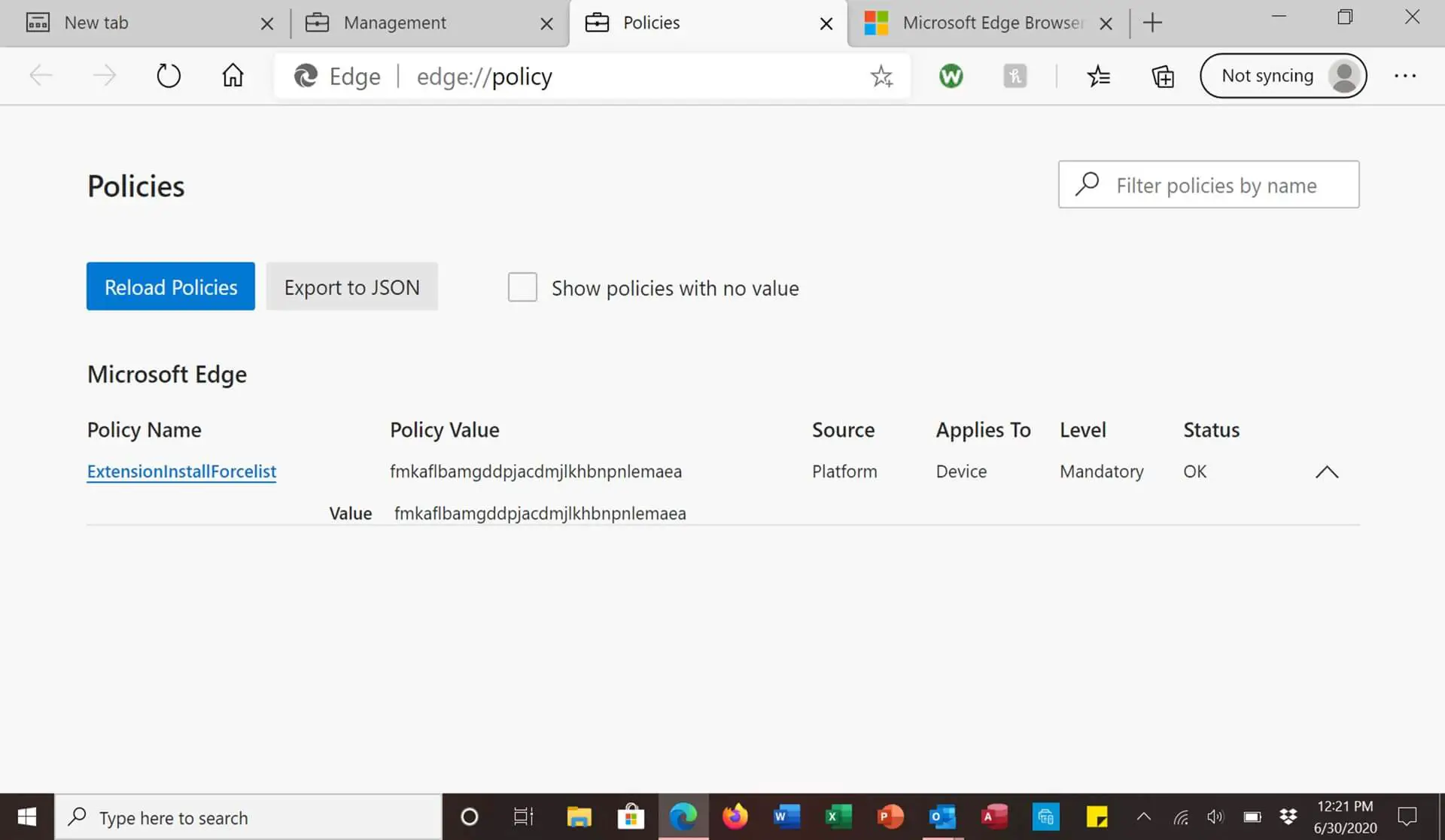 На следующем снимке экрана вы можете видеть, что идентификатор расширения fmkaflbamgddpjacdmjlkhbnpnlemaea что соответствует надстройке Edge. Вы также можете увидеть соответствующее имя политики на основе реестра («ExtensionInstallForceList“) На этой странице.