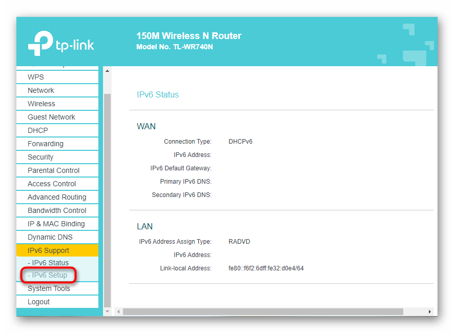 По умолчанию откроется страница статуса подключения, но вам нужно перейти к его настройкам. Для этого выберите раздел «IPv6 Setup».