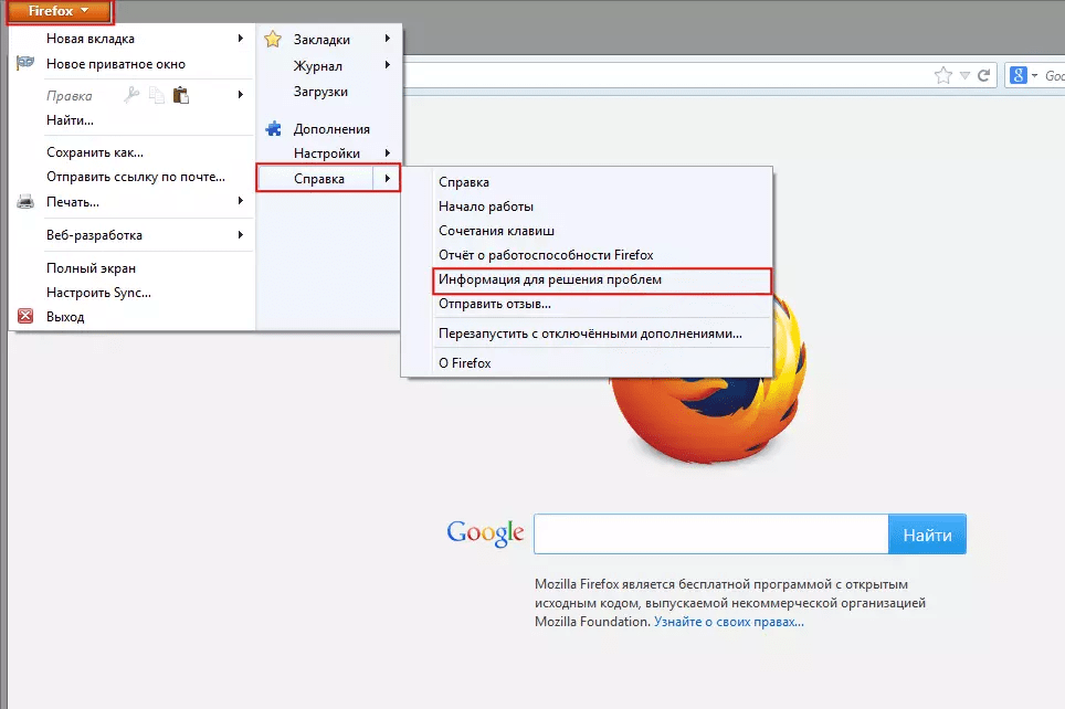 Способ удаления поисковика Webalta в браузере Mozilla несколько отличается от чистки в Оpera. Заходим в «Справка» и выбираем «Информация для решения проблем».
