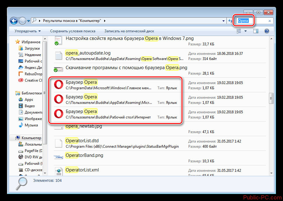 На следующем этапе следует удалить все имеющиеся на компьютере ярлыки браузеров. Для этого введите в графе поиска название поисковика и сотрите все найденные копии. Поиск следует начинать с раздела «Компьютер».