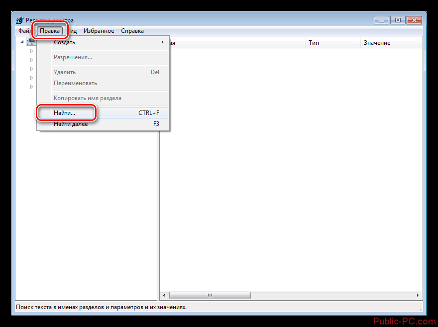 - Откройте поиск по реестру, как это было описано в инструкции выше;