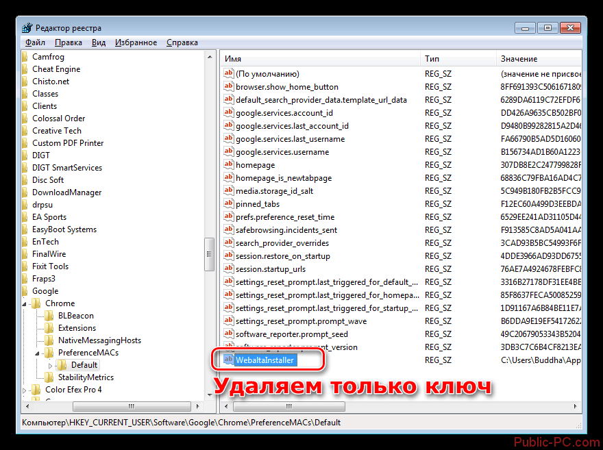 1. Первым действием нужно просканировать диск С на наличие файлов с именем, содержащим слово webalta. Это делается обычным поисковиком Windows (Ctrl+F). 2. Все что найдете связанное со словом webalta удаляем. 3. Далее, в командной строке (это в меню пуск или клавиши Win+R) пишем: regedit 4. Откроется редактор реестра, в котором нужно найти все записи, содержащие слово webalta. Это можно сделать, нажав Ctrl+F. После удаления каждой записи нажимайте F3.