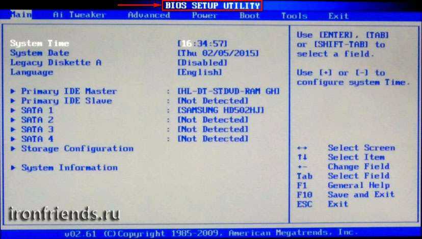 Выход в «AMI BIOS» осуществляется при нажатии клавиш DEL или F2.