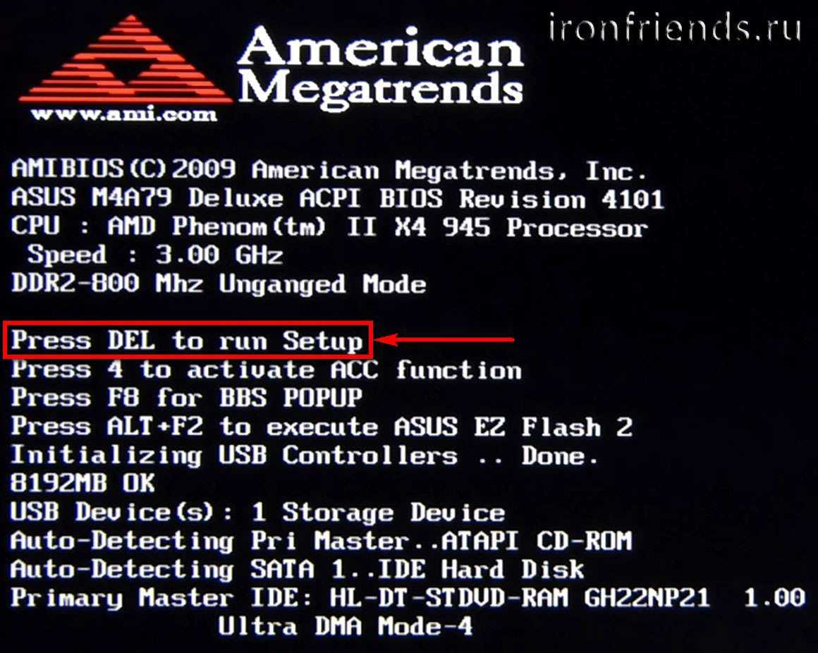 AMI BIOS: клавиша F2 – вход в настройки BIOS.