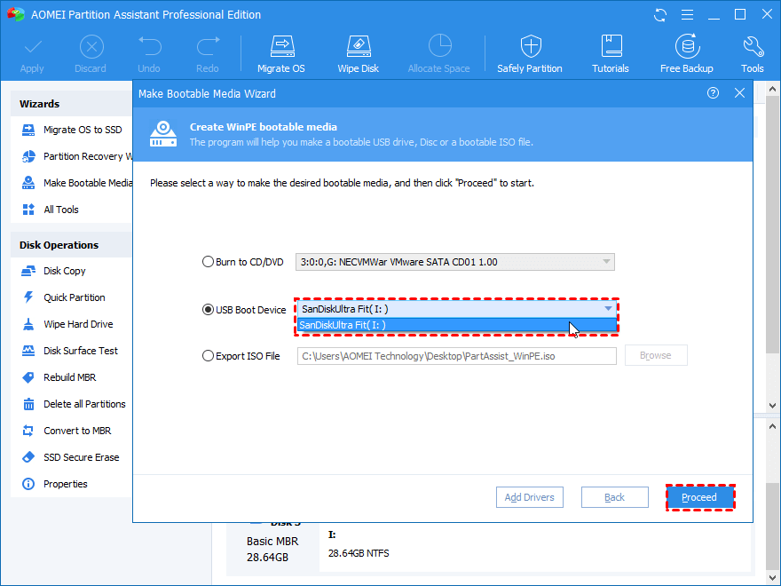 Step 3. Choose the USB drive and click on “Proceed” to finish creating a bootable media drive/disk.