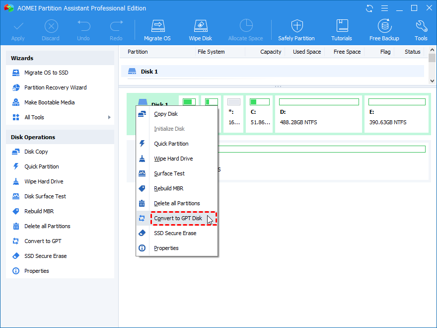 If your disk is MBR and you want to convert it to GPT, please choose «Convert to GPT Disk».