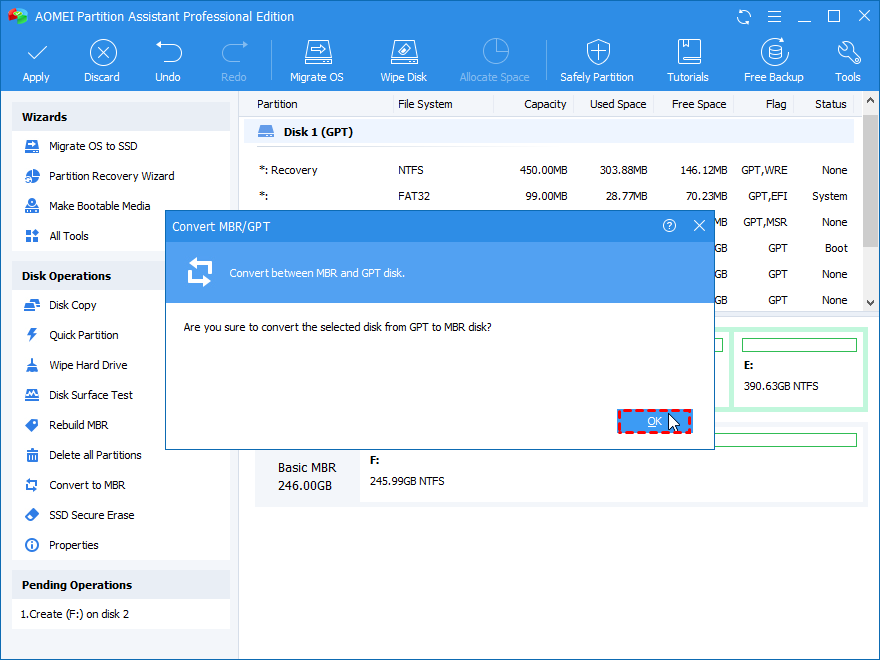 To convert GPT disk with OS installed to MBR for better compatibility, most users might want to finish the conversion without losing data. Then AOMEI Partition Assistant Professional is a great tool, which can convert GPT to MBR (or MBR to GPT) without damaging inside data including the operating system. That is a bigger advantage than converting GPT to MBR via Command Prompt, which requires you to delete all partitions before conversion.