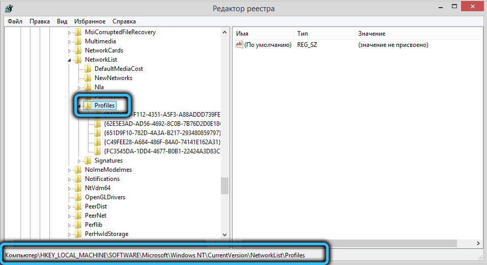 В редакторе переходим в ветку HKEY_LOCAL_MACHINE\SOFTWARE\Microsoft\Windows NT\CurrentVersion\NetworkList\Profiles, раскрываем и ветку Profiles, в которой будут указаны все доступные сетевые подключения.
