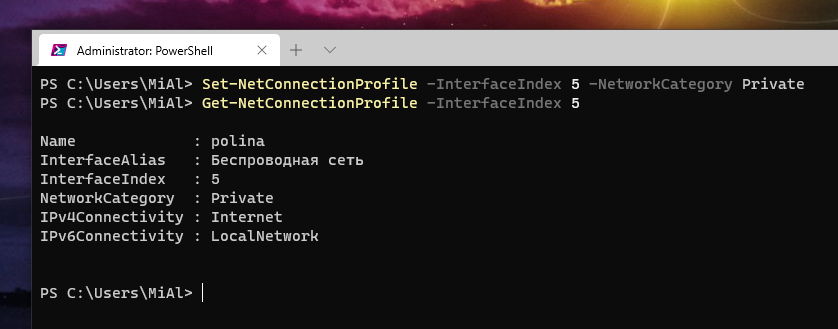 Name : polina InterfaceAlias : Беспроводная сеть InterfaceIndex : 5 NetworkCategory : Public IPv4Connectivity : Internet IPv6Connectivity : NoTraffic