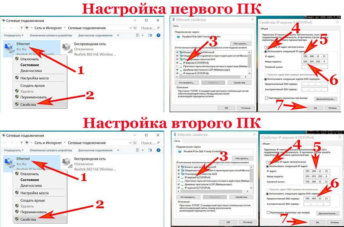 Прописываем на компьютерах индивидуальные сетевые настройки. Выполняется третий шаг аналогично, как и на Windows 10. Поэтому повторно расписывать, как его сделать не будем. Смотрите выше в статье пункт «Действие No 3».