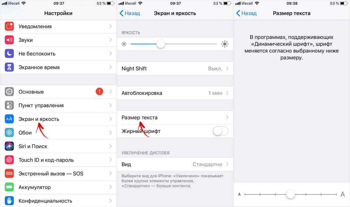 Чтобы изменить размер букв, необходимо перейти в «Настройки» → «Экран и яркость» → «Размер текста». Для смены масштаба – прокрутить колесико. Можно выставить «Жирный шрифт» активировав флажок переключателя.