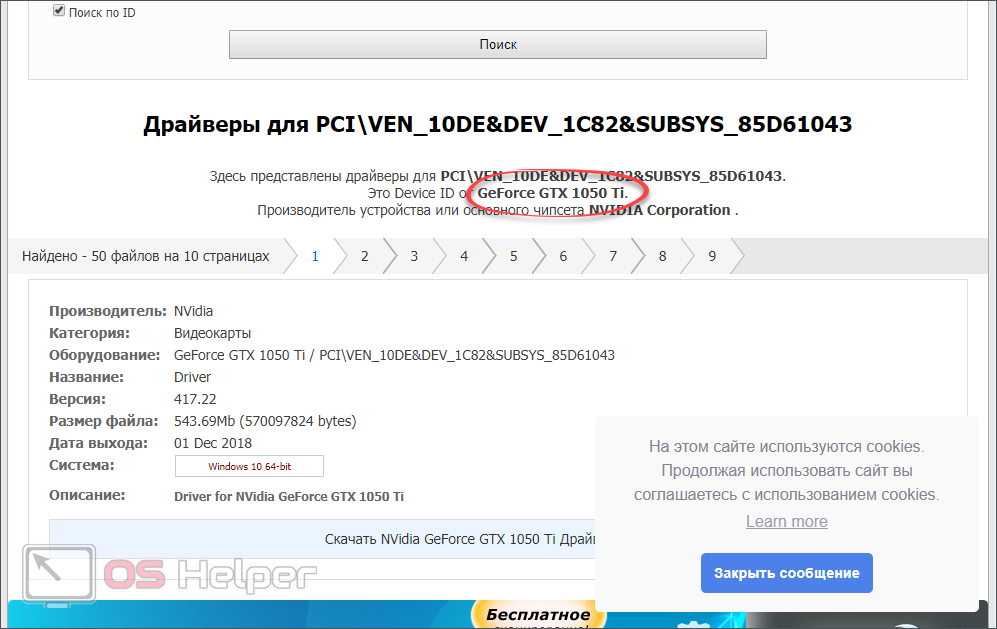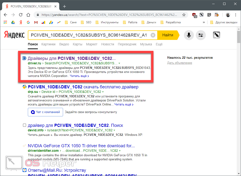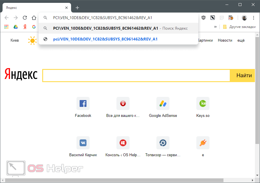 - Параметры DEV и VEN отобразятся в окошке «Значения». Скопируйте их в буфер обмена, перейдите на страницу онлайн-сервиса DevID. info и вставьте данные в поисковую строку. В результате вы увидите не только название видеоплаты, но и список подходящих для неё драйверов.