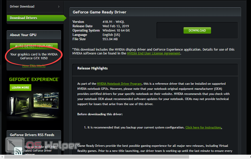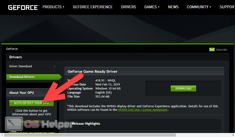 - Изначально вам нужно перейти на сайт nvidia.com. После этого выбираем раздел с драйверами и жмем отмеченную на скриншоте кнопку.