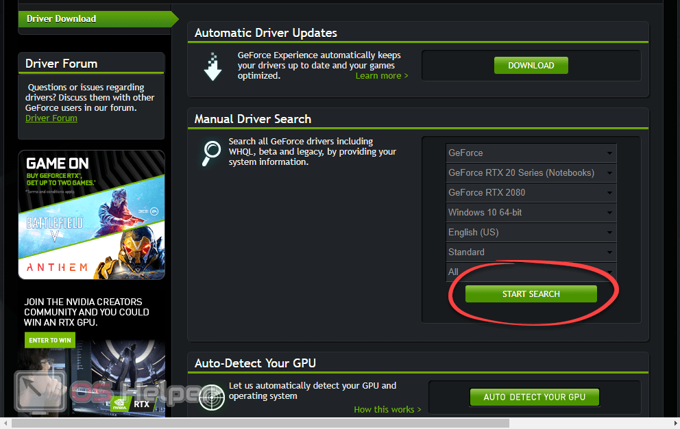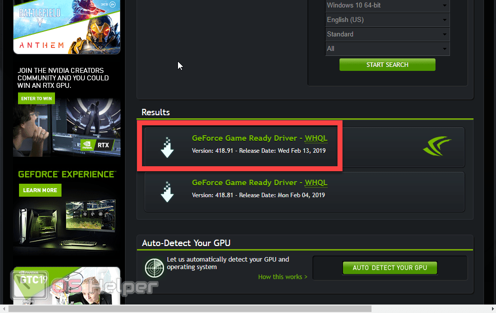 - Жмем кнопку автоматического определения графического адаптера онлайн.