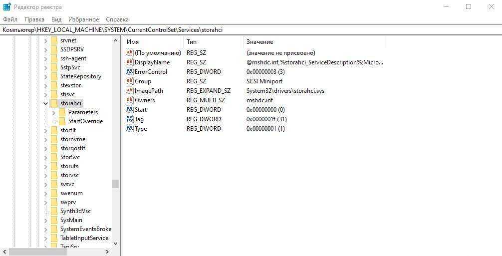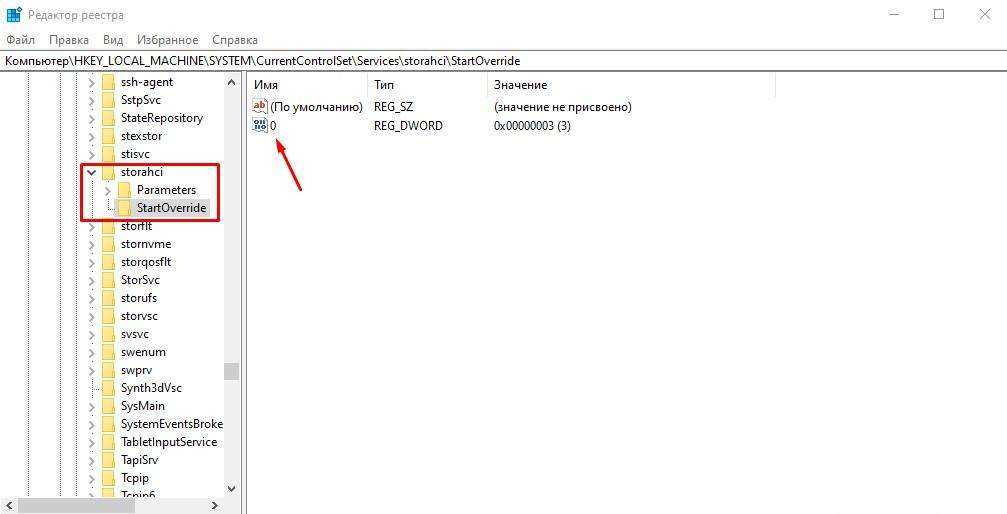 Далее в этом же разделе «storahci» нужно выбрать подраздел «StartOverride».
